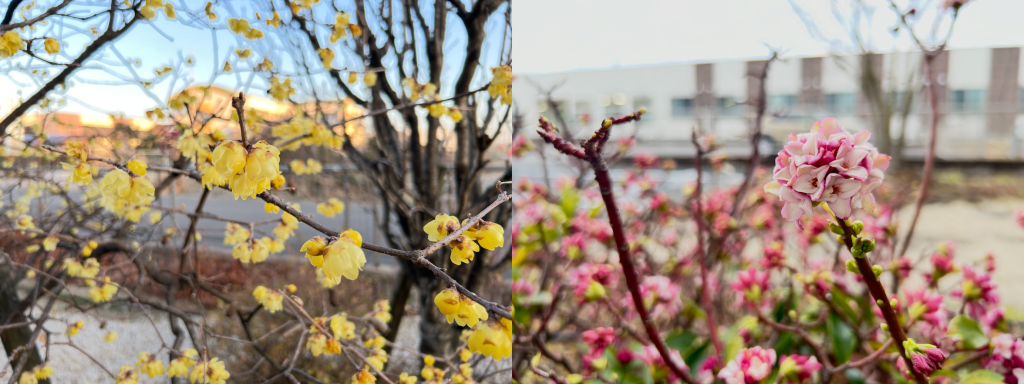 先月、咲き始めをご紹介したクリニック北側の蝋梅(ロウバイ)は、その後満開となり、今はピークを越えつつあります(写真左)。花の美しさに加え、梅に似た甘い香りが漂うのも特徴で、満開の時期は毎年、冬の終わりを感じさせてくれます。