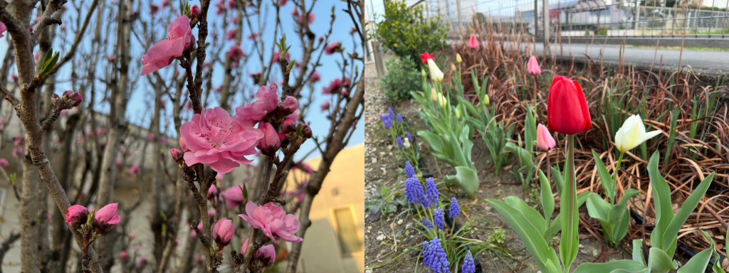 一方、クリニック南側の日当たりのよいエリアでは、沈丁花(ジンチョウゲ)が咲き始めました(写真右)。薄いピンク色の小さな花が枝先に集まり、手毬のように可愛らしく目に映ります。夏の梔子(クチナシ)、秋の金木犀(キンモクセイ)と並び三大香木のひとつで、沈丁花の甘い香りが漂い始めると、春の訪れを実感します。