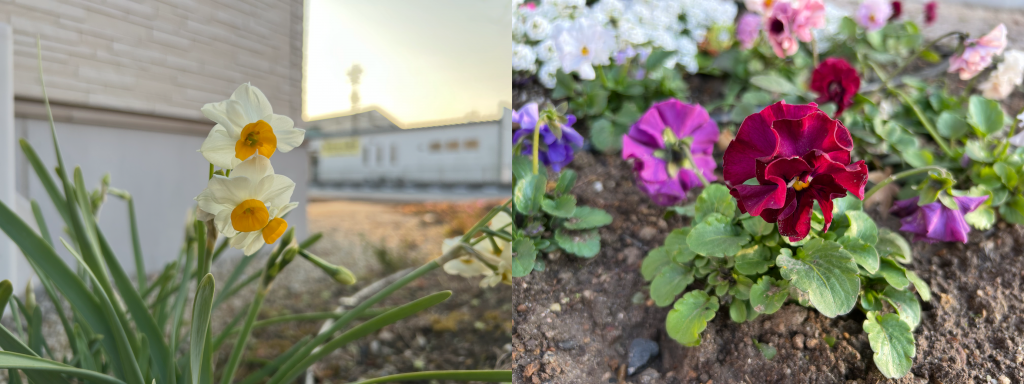 写真右も、クリニック南側に咲くスミレ科のビオラです。寒い季節に咲く数少ない草花として知られています。その名が意味する紫色の可憐な印象の花です。パンジーより花がやや小さいとされるもその厳密な区別は曖昧なようです。