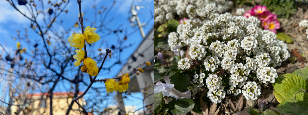 写真右は、昨年12月に当欄でご紹介したクリニック南側のアリッサムです。あれからずっと咲き続け、寒さ厳しくなった今、まさに満開状態となっています。小さな花が集まってブーケ状なのがとてもかわいらしいです。英語ではスイートアリッサム(sweet alyssum)と呼ばれ、こちらも甘い香りに起因します。